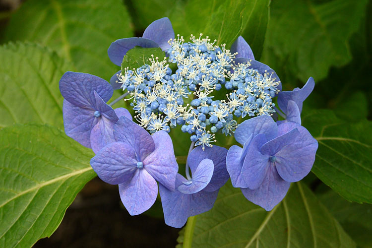 梅雨の晴れ間、公園の一角をガクアジサイが彩っていました。 一つひとつの花が、中央の小さな花の集団と、周囲の装飾花の縁取りで構成され、涼しげで精緻な趣きがあります。